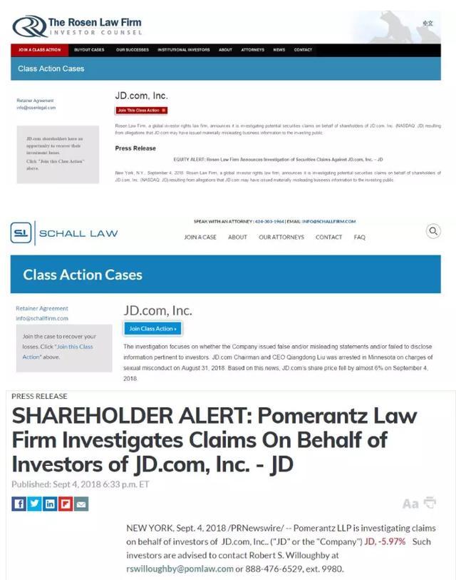 近日,美国方面传来一则涉及京东公司的坏消息:由于涉嫌发布虚假信息,作为美国上市公司的京东,已经被其部分美国的投资人给投诉了。目前,有三家美国的律所(Rosen, Schall和Pomerantz)已经介入此事并准备展开调查,以决定是否代表投资人对京东提起法律诉讼。