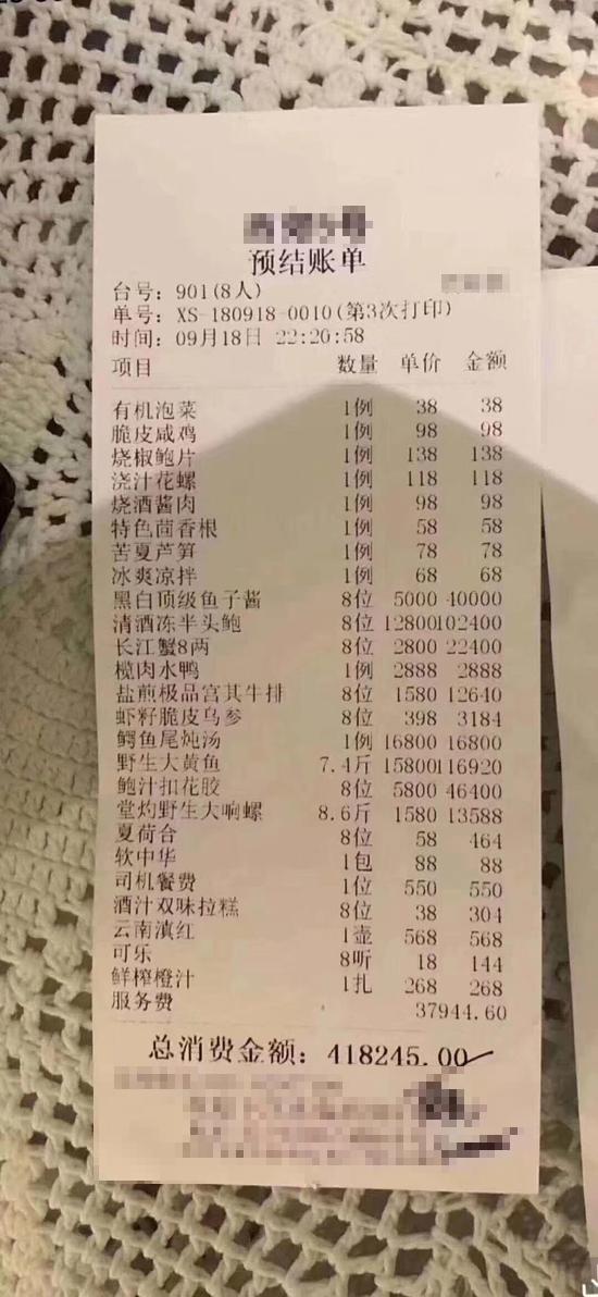 上海西郊5号40万元的“天价账单”事件持续引发关注,“天价账单”餐厅位于上海西郊宾馆。台号为901,用餐人数为8人,显示结账时间为18日晚10时20分。账单显示8人用餐,20项菜品,总价共计418245元,账单右下角有手写标注“实收”40万元。
